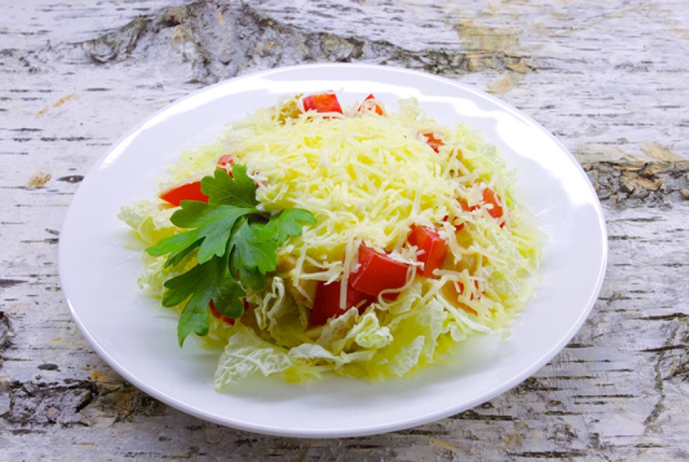 Помидоры, капуста пекинская, чеснок,филе куриное, сыр, майонез, соевый соус,масло растительное - 200г.