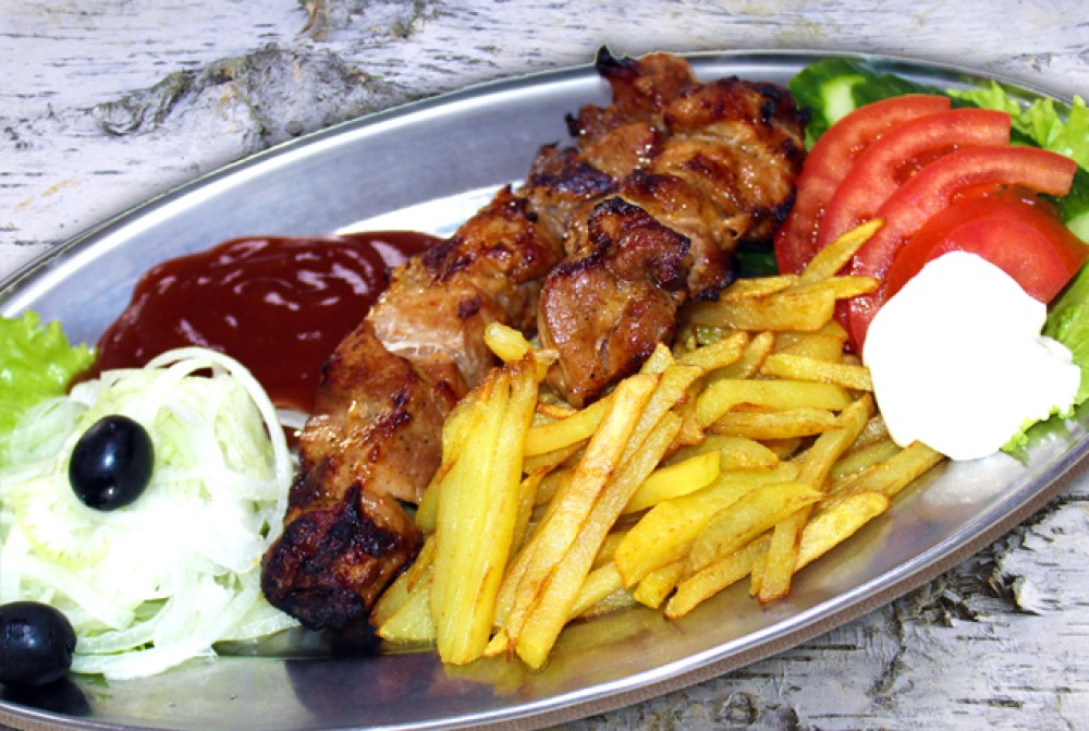 Лопатка - 250г, лук маринованный, кетчуп, хлеб.
