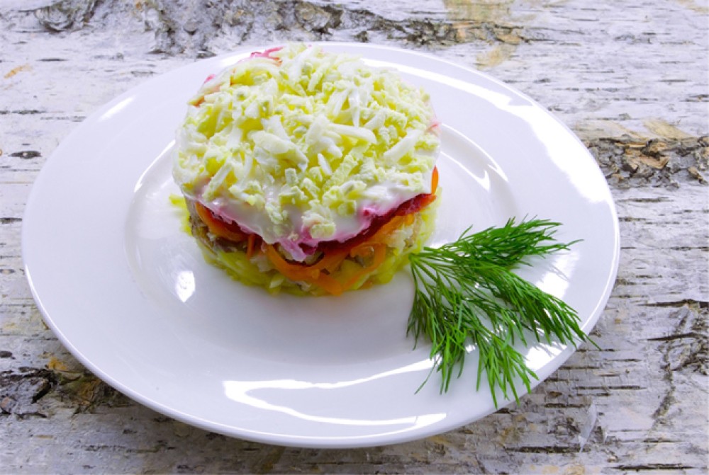 Филе сельди, картофель, свекла, морковь, лук, майонез, яйцо - 200г.