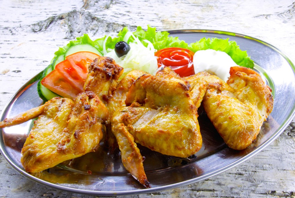 Крыло куриное - 350г, майонез, кетчуп, лук маринованный, хлеб.