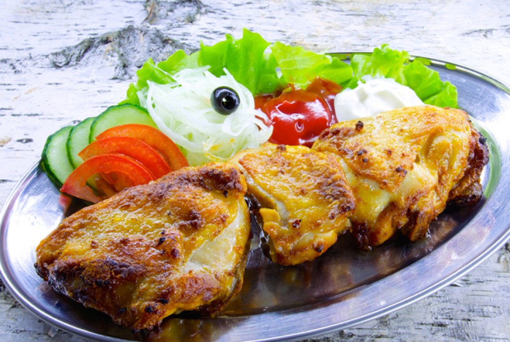 Бедро куриное - 350г, майонез, кетчуп, лук маринованный, хлеб.