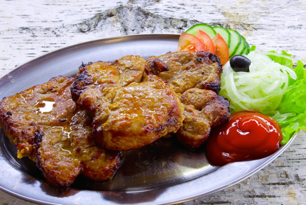 Вырезка шейная крупным куском - 450г, лук маринованный, кетчуп, хлеб.